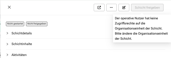 Der oder die operative Mitarbeitende hat keine Berechtigung, die Schicht zu sehen oder zu bearbeiten – z. B. weil die Schicht einer anderen Organisationseinheit zugeordnet ist, als die, auf die die Person Zugriff hat.
