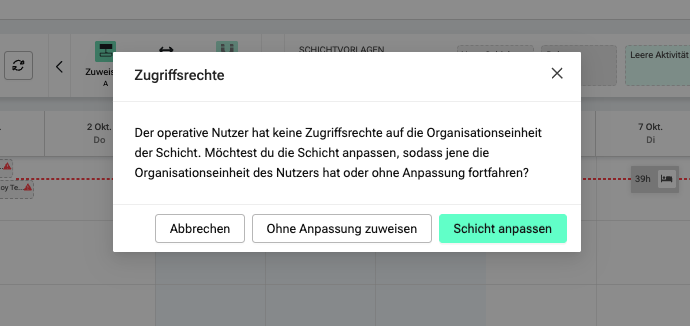 Wenn Ihr eine Schicht freigeben wollt, bei der die zugewiesene Person keine Zugriffsrechte auf die Organisationseinheit der Schicht hat.