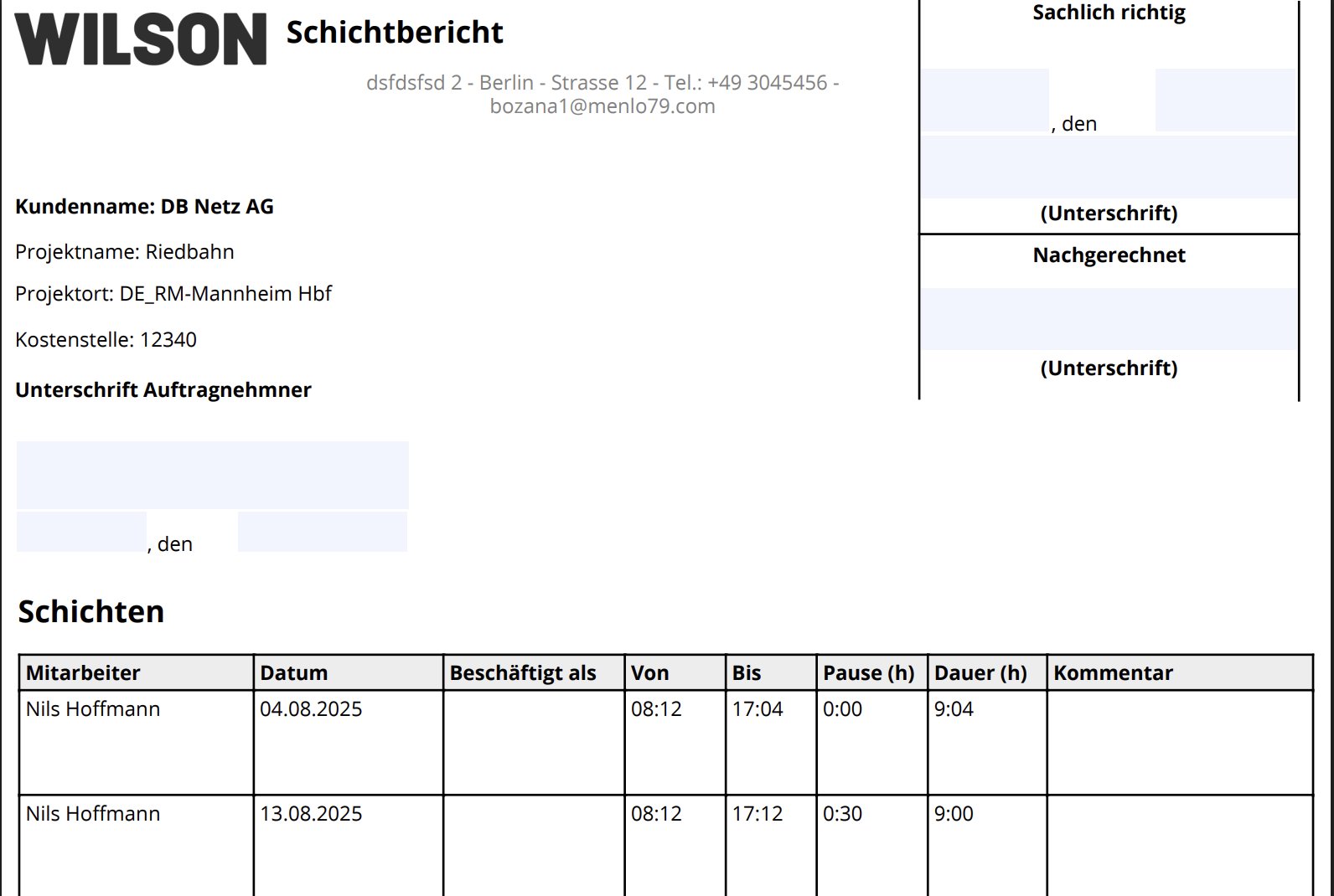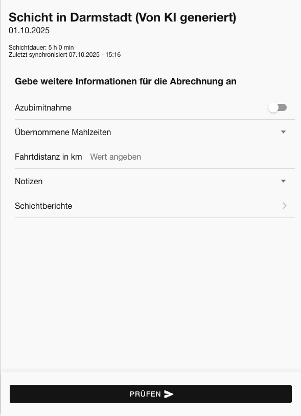 Der Schichtbericht dient als Nachweis über durchgeführte Schichten und bildet die Grundlage für die spätere Rechnungsstellung. Er ermöglicht es euch,