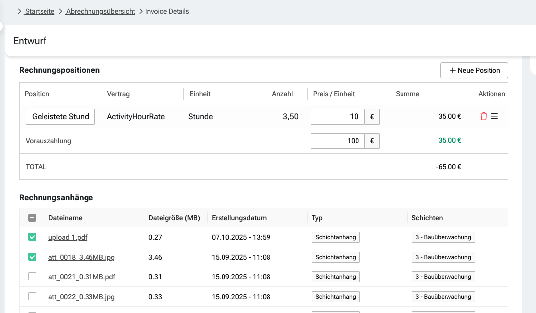 Ihr müsst die Dateien also nicht mehr manuell hinzufügen – WILSON verknüpft die Schichtberichte automatisch mit der jeweiligen Rechnung. Dadurch wird der gesamte Prozess von der Dokumentation über die Freigabe bis hin zur Rechnungsstellung deutlich effizienter.