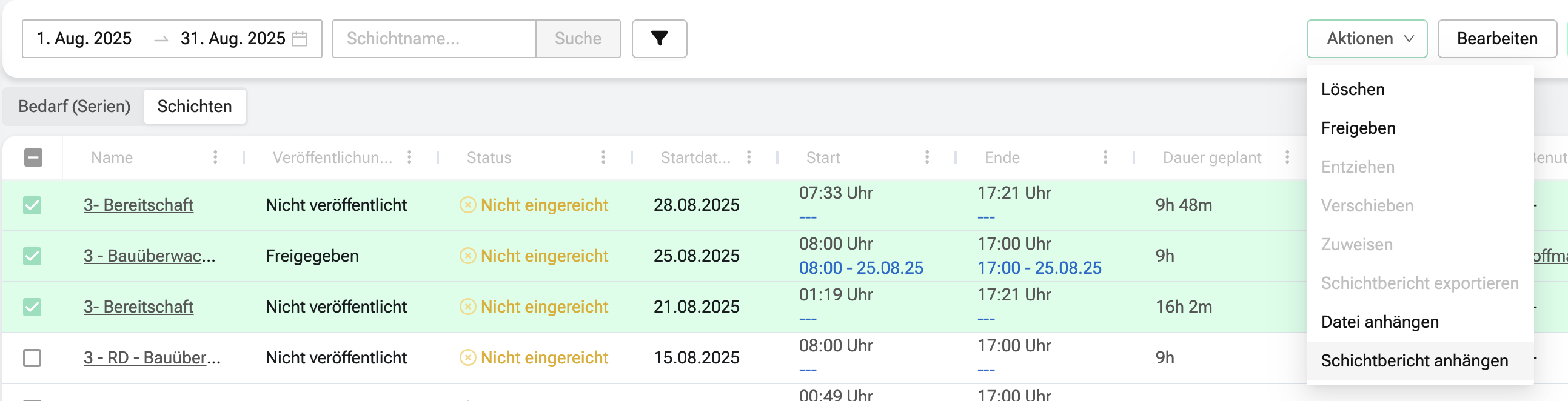 - für welche Schichten bereits Schichtberichte hinterlegt sind,