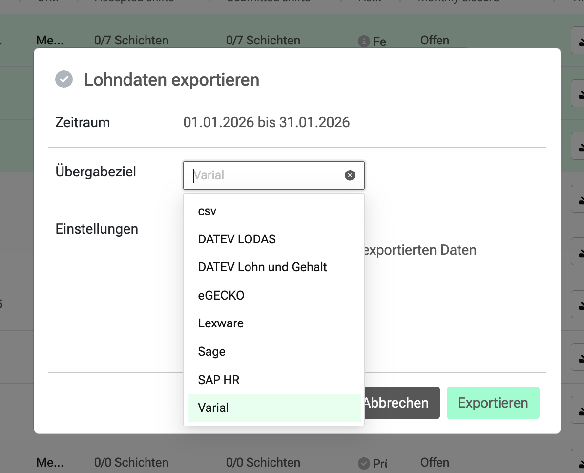 Wähle im Export-Prozess Varial als Übergabeziel aus und du erhältst die Abrechnungspositionen für einen einfachen Upload in deinem Varial System.