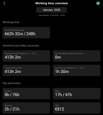 In the mobile app, you can view your working hours in two places: in the home widget on the start screen and in the working hours dashboard.
