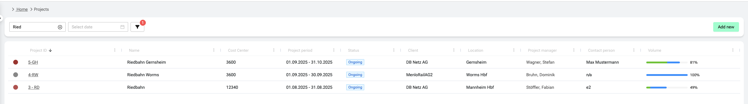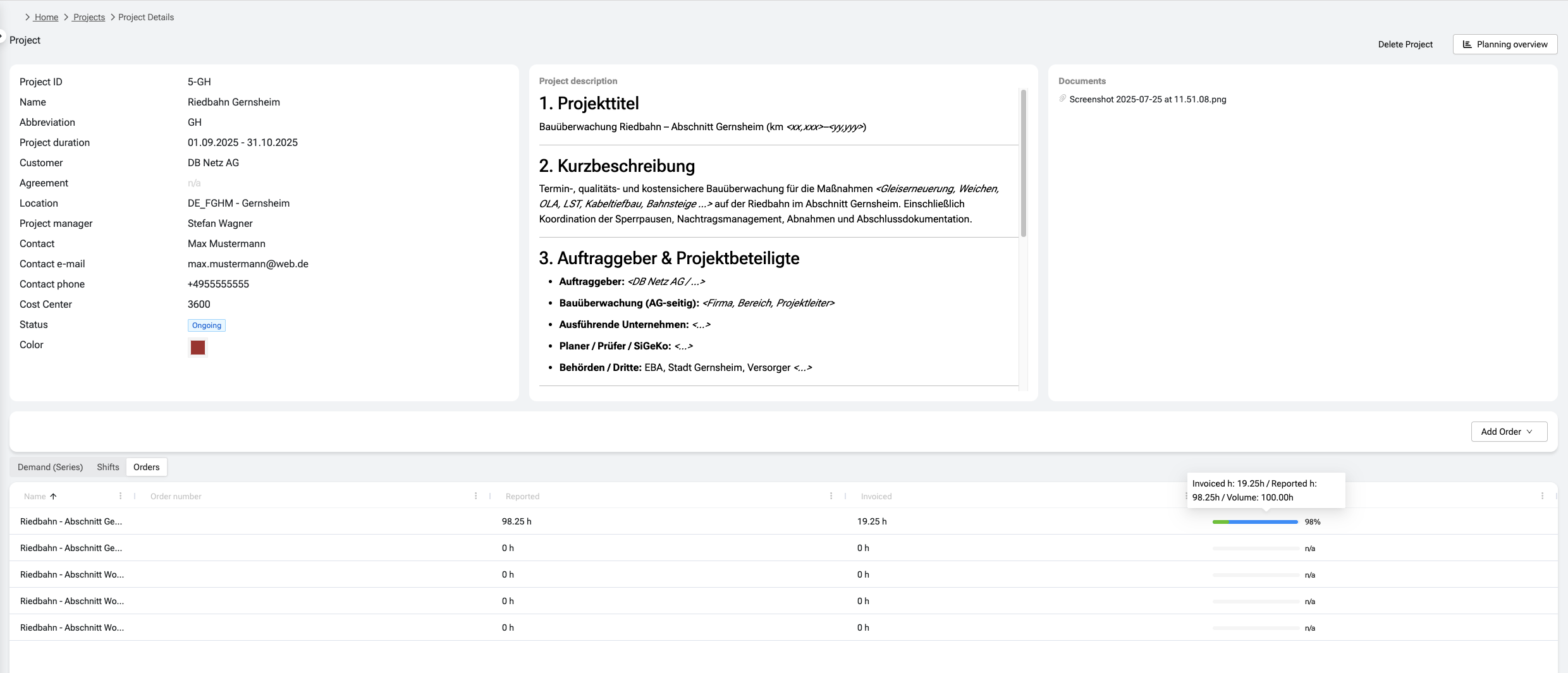 At project level, the overview is primarily used to gain a holistic picture and to detect irregularities early on β for example, a high number of recorded hours combined with low or missing invoicing.